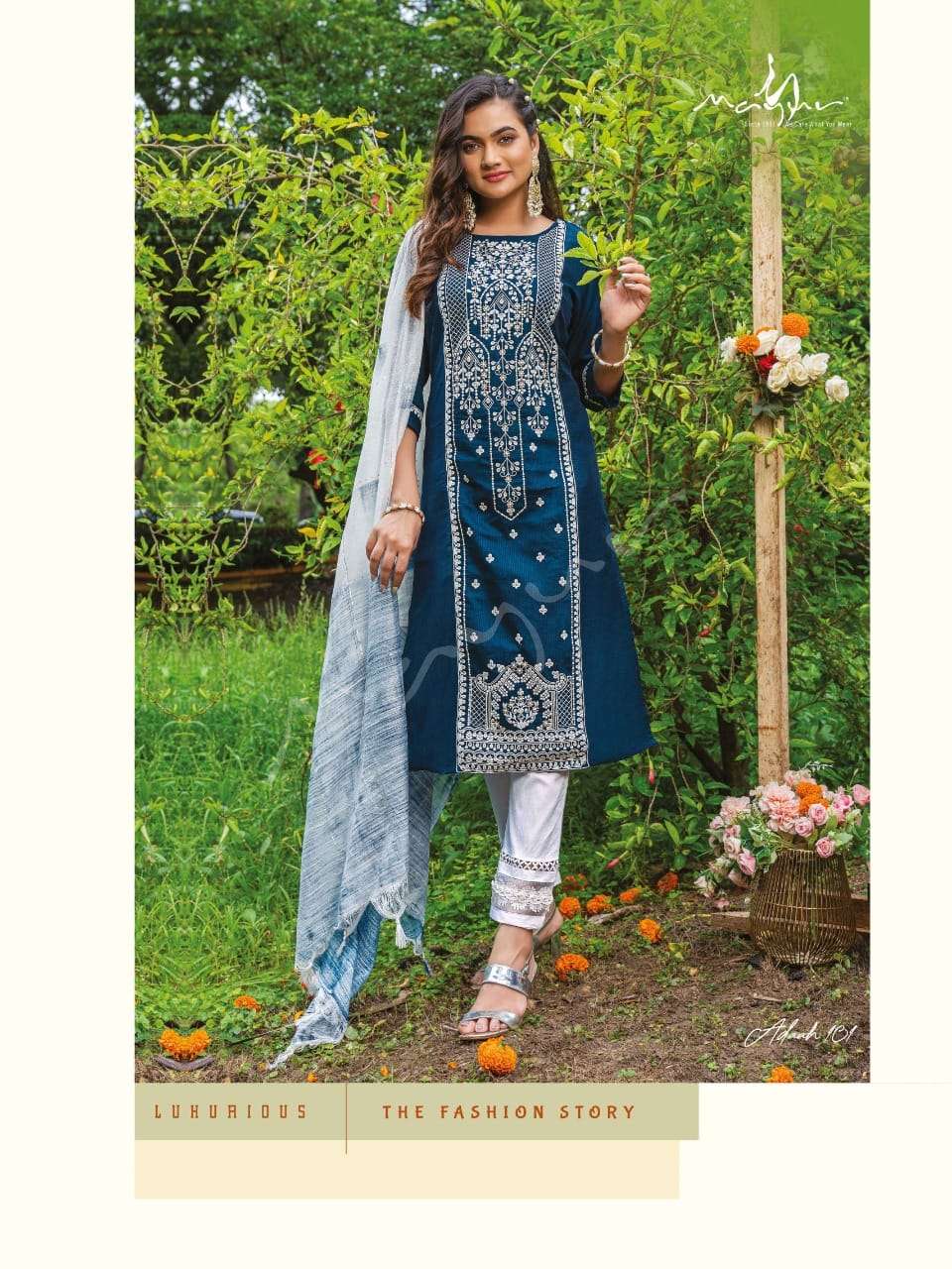 ADAAH BY MAYUR 101 TO 108 SERIES BEAUTIFUL SUITS COLORFUL STYLISH FANCY CASUAL WEAR & ETHNIC WEAR CHINNON DRESSES AT WHOLESALE PRICE
