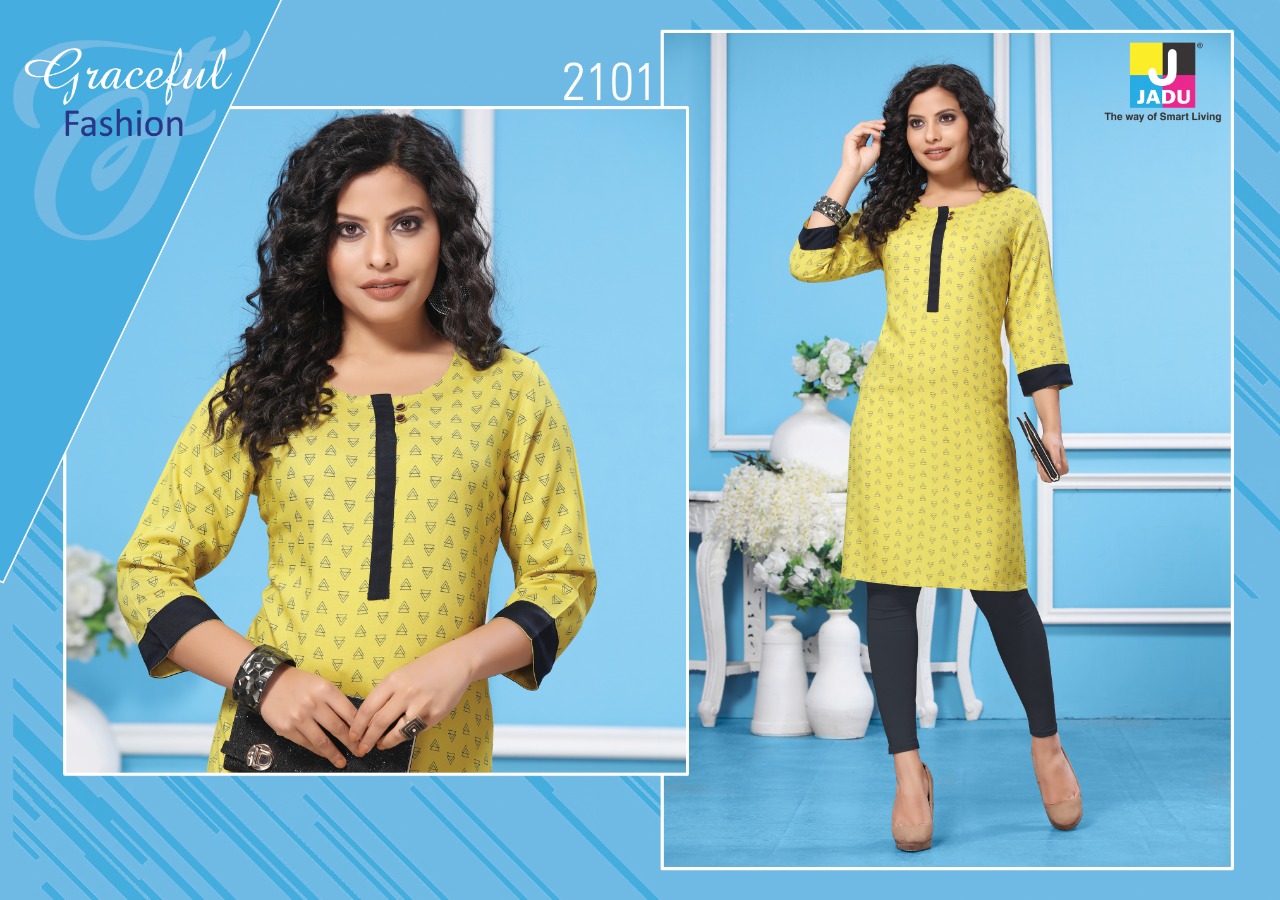 Lily By Jadu 2101 To 2108 Series Beautiful Colorful Stylish Fancy Casual Wear & Ethnic Wear & Ready To Wear Heavy Rayon Kurtis At Wholesale Price