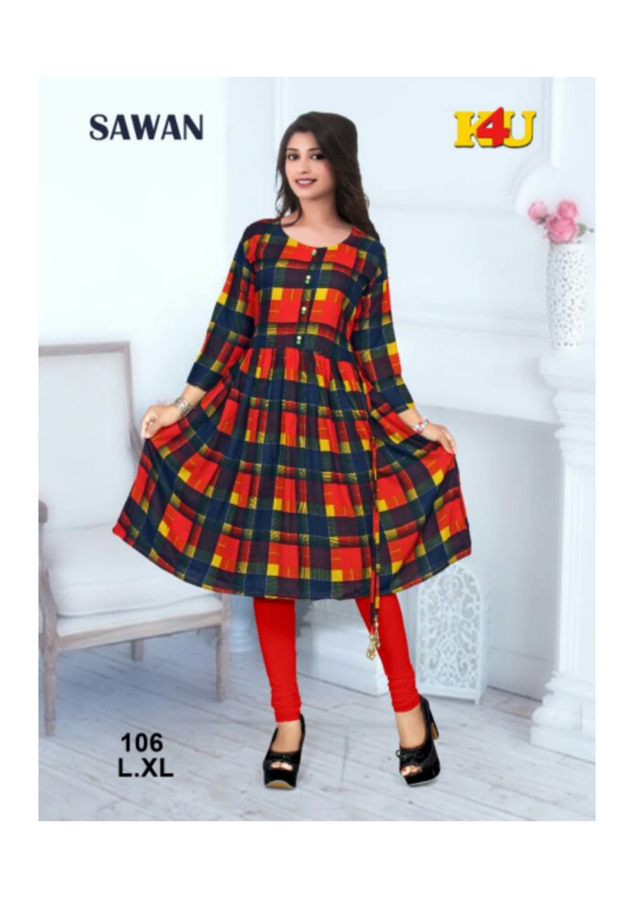 Sawan By K4u 101 To 106 Series Beautiful Stylish Fancy Colorful Casual Wear & Ready To Wear & Ethnic Wear Heavy Rayon Printed Kurtis At Wholesale Price